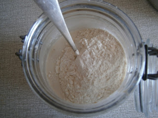 This first picture is the original starter from the fridge that I’ve transferred to a new container - obviously I've discarded half of it and this is the half that I keep and feed (the other half was used for my bread below). After a while the container begins to look a bit worse for the wear so I transfer it about ever 3-4 months – it just depends.This next picture is after I have stirred in some water so that the starter will accept the new flour. I think in Dan’s book he says to use bottled water – which I don’t buy. I tend to use cool boiled water from when I’ve made tea, I used that water to add to the starter. I now don’t measure the additions as I used to – I just do it by feel and look. I suppose this is how I do a lot of my cooking – I just know what it should be like and have often been tested in my weights and measures. I have found I come usually within one to two grams of just about any measure. How’s that for accuracy?